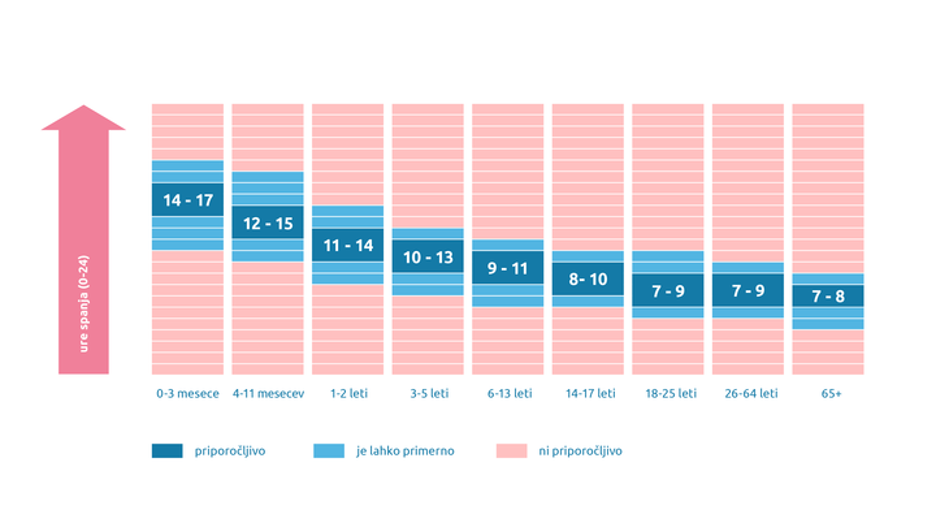 Slika 2: priporočljivo trajanje spanca glede na starost.