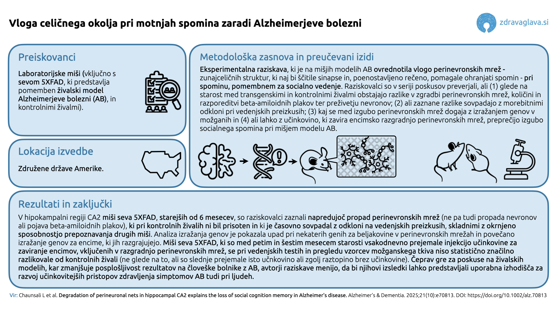 Eden izmed najbolj uničujočih simptomov Alzheimerjeve bolezni (AB), najpogostejšega vzroka za demenco v svetovnem merilu, je izguba sposobnosti za prepoznavo bližnjih in bolniku poznanih oseb. Bolniki imajo sprva pogosto težave pri prepoznavi znanih obrazov, priklicu imen ter pomnjenju interakcij, kasneje pa lahko nerazpoznavanje bližnjih oseb in težave pri interpretaciji iztočnic v socialnih stikih močno otežijo sporazumevanje ter vodijo v socialno izolacijo in osamljenost. Raziskave na živalskih modelih AB in tkivnih vzorcih možganovine bolnikov z AB kažejo, da, poleg klasičnih bolezenskih sprememb, ki vključujejo kopičenje beta-amiloidnih plakov in nevrofibrilarnih pentelj v področjih možganov, ki so ključna za pomnjenje, prihaja tudi do sprememb zunajceličnih struktur, imenovanih perinevronske mreže (angl. perineuronal nets). Te naj bi pomembno prispevale k stabilizaciji tamkajšnjih sinaps, s čimer naj bi – poenostavljeno rečeno – ohranjale tudi spomine. Avtorji povzete raziskave so zato preverjali, kako izguba perinevronskih mrež v določenem delu hipokampusa laboratorijskih miši vpliva na njihovo socialno vedenje in pomnjenje.