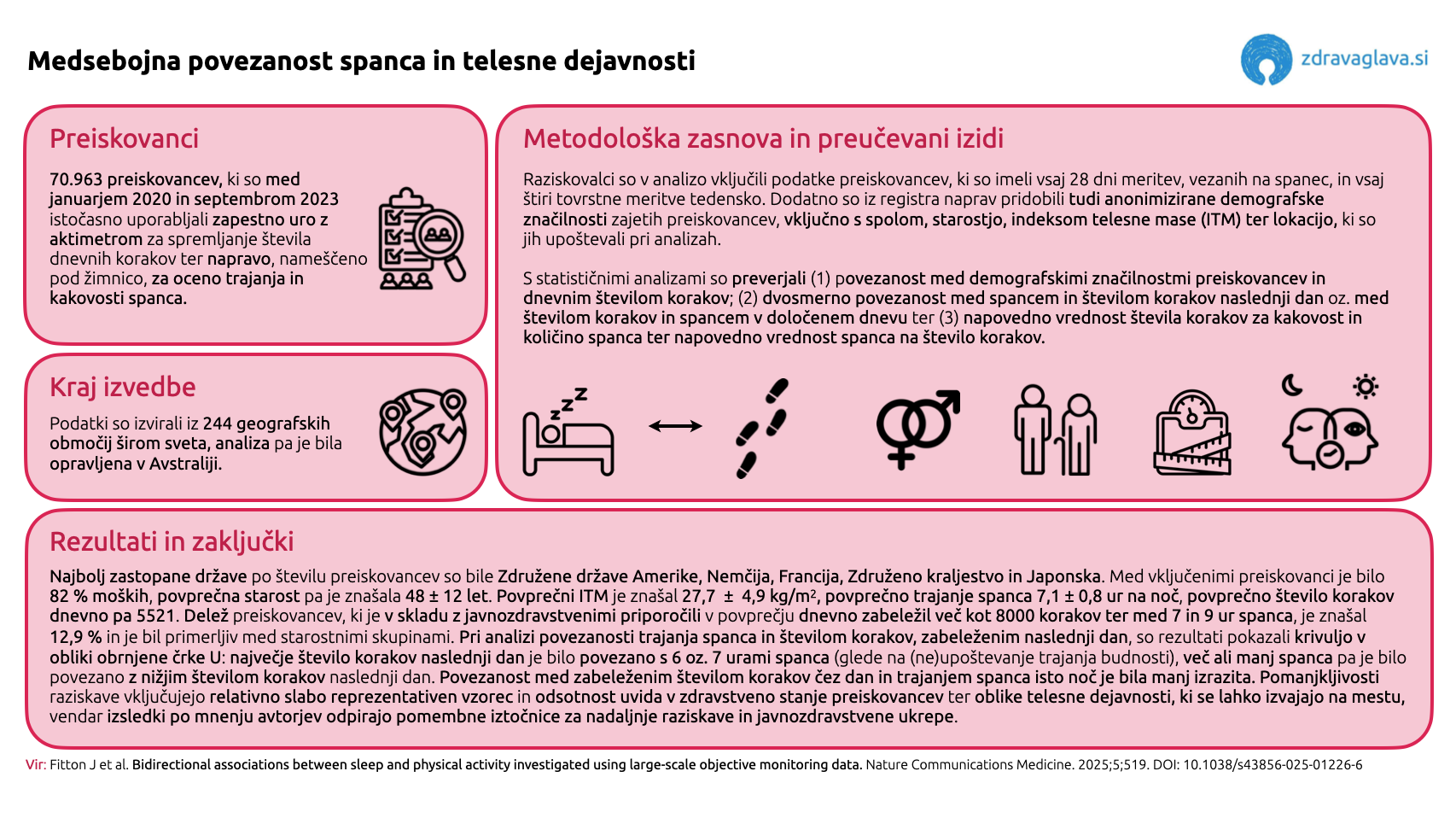 Številni raziskovalni izsledki kažejo, da ustrezen spanec in telesna dejavnost bistveno prispevata k zdravo- in dolgoživosti. Čeprav nekatere raziskave izkazujejo ugoden vpliv (predvsem zmerne) telesne dejavnosti na kakovost in trajanje spanca, je njihov domet pogosto omejen zaradi relativno majhnih vzorcev in kratkega časa spremljanja, kakor tudi zaradi zanašanja na samoporočane (ter zato manj zanesljive) podatke. Osrednji cilji povzete raziskave, zasnovane z namenom premostitve prej omenjenih pomanjkljivosti, so bili (1) preučiti, koliko preiskovancev sočasno dosega dnevno priporočeno količino telesne dejavnosti in spanca ter (2) ugotoviti njuno morebitno povezanost in (3) naravo le-te.