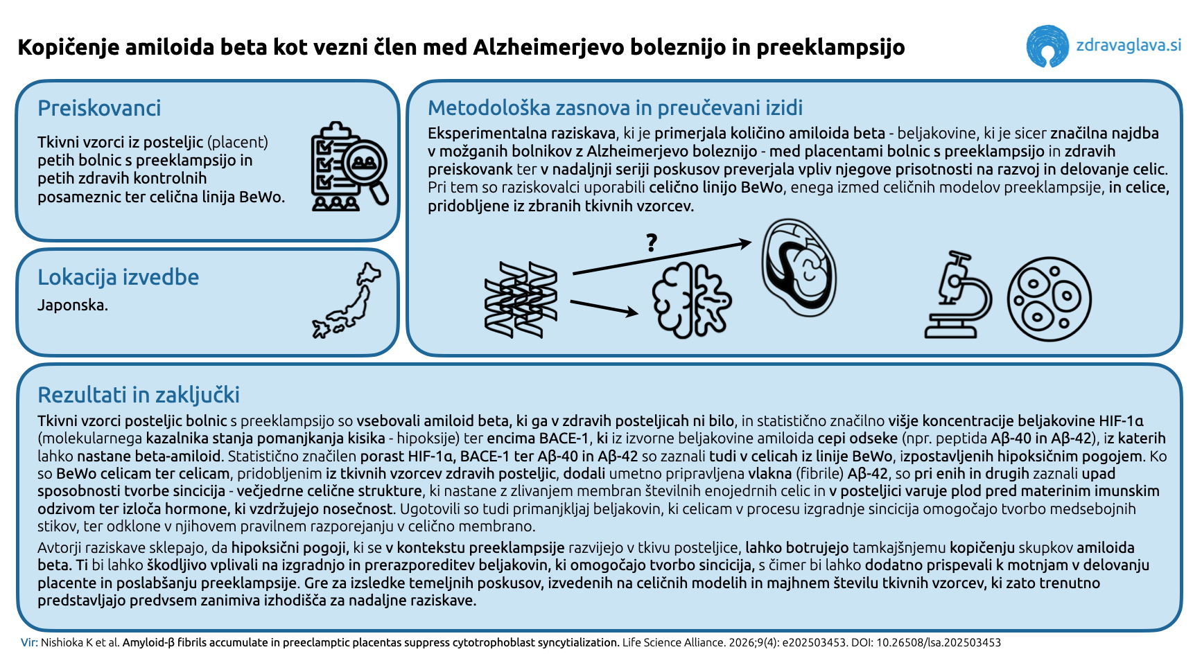 Preeklampsija je bolezensko stanje, ki se pojavlja pri 7 do 10 % nosečnosti ter je povezana z visoko stopnjo obolevnosti in smrtnosti pri materi in plodu. Vzroki preeklampsije še niso docela pojasnjeni, vendar verjetno vključujejo nepravilnosti pri razvoju in delovanju posteljice oz. placente – organa, ki plodu v maternici zagotavlja stalen dotok kisika in hranil z materino krvjo. Posledična hipoksija oziroma stanje pomanjkanja kisika lahko v placenti sproži nadaljnje spremembe, ki po nekaterih raziskovalnih izsledkih vključujejo tudi bolezensko kopičenje beta-amiloida – beljakovine, ki je sicer verjetno najbolj znana kot značilna najdba v možganih bolnikov z Alzheimerjevo boleznijo. Avtorji povzete raziskave so zato na celičnih modelih, ki so delno izvirali tudi iz placent, pridobljenih med porodi bolnic s preeklampsijo in zdravih kontrolnih posameznic, preučevali povezanost med hipoksijo in kopičenjem beta-amiloida ter vplive le-tega na nekatere vidike celičnega razvoja in delovanja.