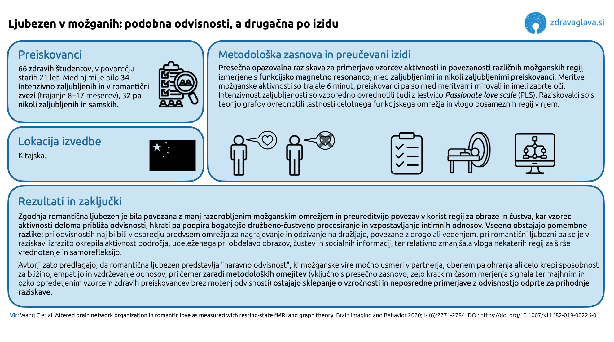 Romantična ljubezen je intenzivno čustveno stanje, ki močno vpliva na pozornost, vedenje, motivacijo in razporejanje kognitivnih virov. Zaljubljeni posamezniki imajo pogosto slabši nadzor pri izvajanju klasičnih nevropsiholoških nalog, hkrati pa boljše sposobnosti “branja” oziroma razumevanja drugih ljudi in socialnega razmišljanja. V eksperimentalnih raziskavah, kjer so udeležencem med slikanjem možganov (s fMRI) prikazovali fotografije ali imena njihovih partnerjev, so opazili izrazito aktivacijo centrov za nagrajevanje, kar je nekatere avtorje spodbudilo k primerjavi romantične ljubezni z odvisnostjo. Ni pa bilo jasno, ali je pri zaljubljenih drugače organizirano tudi možgansko omrežje. Avtorji povzete raziskave so zato želeli opisati, kako je romantična ljubezen povezana s funkcijskimi značilnostmi celotnega omrežja možganov ter s strukturo posameznih vozlišč.